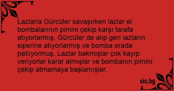 Lazlarla Gürcüler savaşırken lazlar el bombalarının pimini çekip karşı tarafa atıyorlarmış. Gürcüler de alıp geri lazların siperine atıyorlarmış ve bomba orada patlıyormuş. Lazlar bakmışlar çok kayıp veriyorlar karar almışlar ve bombanın pimini çekip atmamaya başlamışlar.