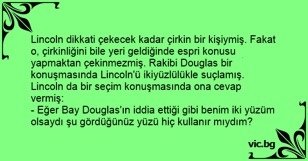 Lincoln dikkati çekecek kadar çirkin bir kişiymiş. Fakat o, çirkinliğini bile yeri geldiğinde espri konusu yapmaktan çekinmezmiş. Rakibi Douglas bir konuşmasında Lincoln'ü ikiyüzlülükle suçlamış. Lincoln da bir seçim konuşmasında ona cevap vermiş: