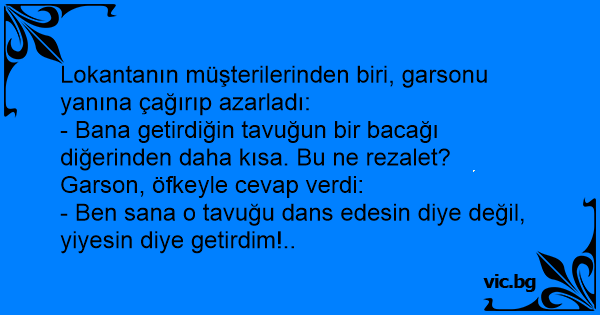 - Bana getirdiğin tavuğun bir bacağı diğerinden daha kısa. Bu ne rezalet?
