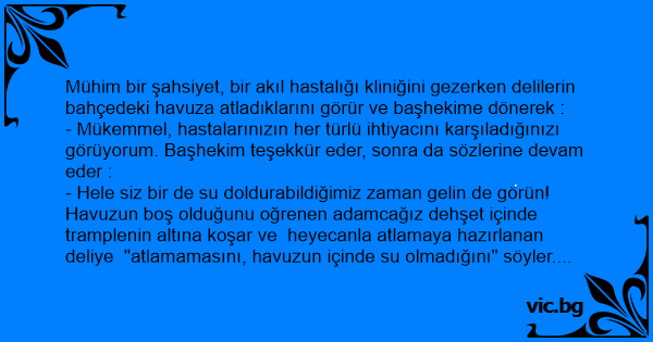 Mühim bir şahsiyet, bir akıl hastalığı kliniğini gezerken delilerin bahçedeki havuza atladıklarını görür ve başhekime dönerek :