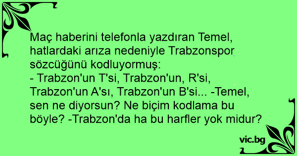 - Trabzon'un T'si, Trabzon'un, R'si, Trabzon'un A'sı, Trabzon'un B'si... -Temel, sen ne diyorsun? Ne biçim kodlama bu böyle? -Trabzon'da ha bu harfler yok midur?