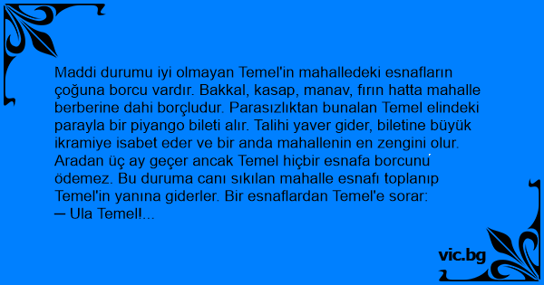 ─ Ula Temel! Hepimiz bileyruz, büyük ikramiye sana çıkdi. Mahallenun en zencuni sen oldin. Ha o zaman uc aydir niye ödemeysun bize olan borcini?