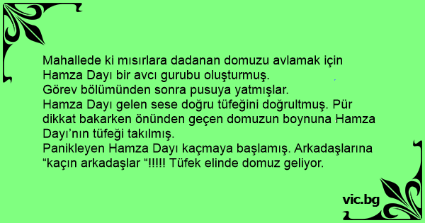Hamza Dayı gelen sese doğru tüfeğini doğrultmuş. Pür dikkat bakarken önünden geçen domuzun boynuna Hamza Dayı’nın tüfeği takılmış.