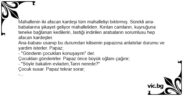 Mahallenin iki afacan kardeşi tüm mahalleliyi bıktırmış. Sürekli ana-babalarına şikayet geliyor mahalleliden. Kırılan camların, kuyruğuna teneke bağlanan kedilerin, lastiği indirilen arabaların sorumlusu hep afacan kardeşler.