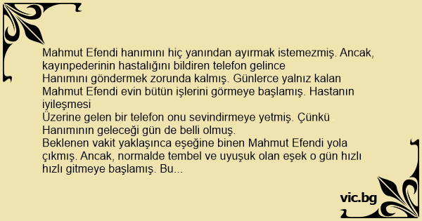 Mahmut Efendi hanımını hiç yanından ayırmak istemezmiş. Ancak, kayınpederinin hastalığını bildiren telefon gelince