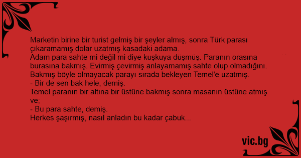 Adam para sahte mi değil mi diye kuşkuya düşmüş. Paranın orasına burasına bakmış. Evirmiş çevirmiş anlayamamış sahte olup olmadığını.