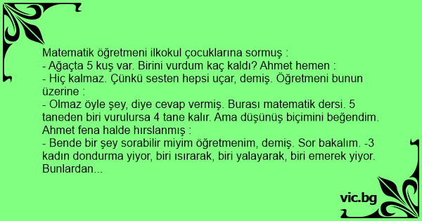 - Olmaz öyle şey, diye cevap vermiş. Burası matematik dersi. 5 taneden biri vurulursa 4 tane kalır. Ama düşünüş biçimini beğendim. Ahmet fena halde hırslanmış :