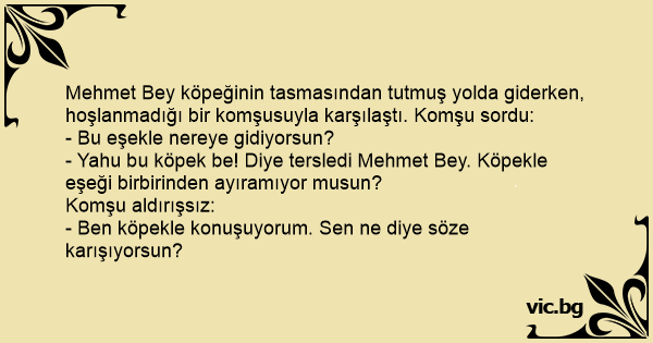 Mehmet Bey köpeğinin tasmasından tutmuş yolda giderken, hoşlanmadığı bir komşusuyla karşılaştı. Komşu sordu: