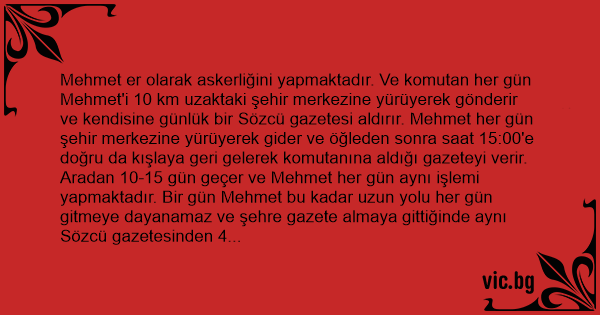 Mehmet er olarak askerliğini yapmaktadır. Ve komutan her gün Mehmet'i 10 km uzaktaki şehir merkezine yürüyerek gönderir ve kendisine günlük bir Sözcü gazetesi aldırır. Mehmet her gün şehir merkezine yürüyerek gider ve öğleden sonra saat 15:00'e doğru da kışlaya geri gelerek komutanına aldığı gazeteyi verir. Aradan 10-15 gün geçer ve Mehmet her gün aynı işlemi yapmaktadır. Bir gün Mehmet bu kadar uzun yolu her gün gitmeye dayanamaz ve şehre gazete almaya gittiğinde aynı Sözcü gazetesinden 4 adet alır ve karargaha geri döner ve komutana gazetelerden bir tanesini verir. Diğer 3 gazeteyi de kendisinde saklar.