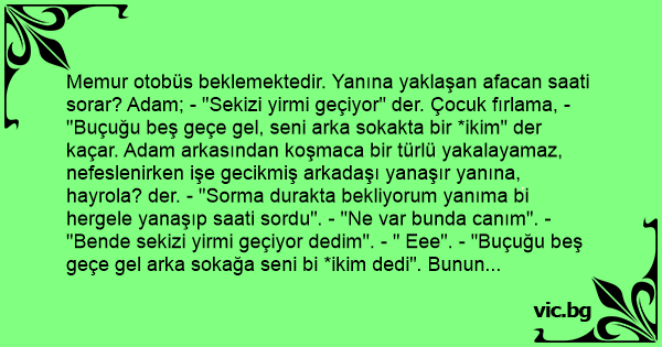 Memur otobüs beklemektedir. Yanına yaklaşan afacan saati sorar? Adam; - "Sekizi yirmi geçiyor" der. Çocuk fırlama, - "Buçuğu beş geçe gel, seni arka sokakta bir *ikim" der kaçar. Adam arkasından koşmaca bir türlü yakalayamaz, nefeslenirken işe gecikmiş arkadaşı yanaşır yanına, hayrola? der. - "Sorma durakta bekliyorum yanıma bi hergele yanaşıp saati sordu". - "Ne var bunda canım". - "Bende sekizi yirmi geçiyor dedim". - " Eee". - "Buçuğu beş geçe gel arka sokağa seni bi *ikim dedi". Bunun üzerine arkadaşı saatine bakar sekiz buçuktur, ve; - "Acelen ne kardeşim daha beş dakika var".