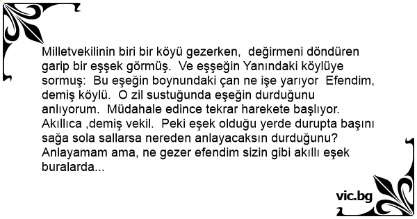 Milletvekilinin biri bir köyü gezerken, değirmeni döndüren garip bir eşşek görmüş. Ve eşşeğin Yanındaki köylüye sormuş: Bu eşeğin boynundaki çan ne işe yarıyor Efendim, demiş köylü. O zil sustuğunda eşeğin durduğunu anlıyorum. Müdahale edince tekrar harekete başlıyor. Akıllıca ,demiş vekil. Peki eşek olduğu yerde durupta başını sağa sola sallarsa nereden anlayacaksın durduğunu? Anlayamam ama, ne gezer efendim sizin gibi akıllı eşek buralarda...