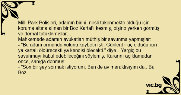 - "Bu adam ormanda yolunu kaybetmişti. Günlerdir aç olduğu için ya kartalı öldürecekti,ya kendisi ölecekti." diye…Yargiç bu savunmayı kabul edebileceğini söylemiş. Kararını açıklamadan önce, sanığa dönmüş: