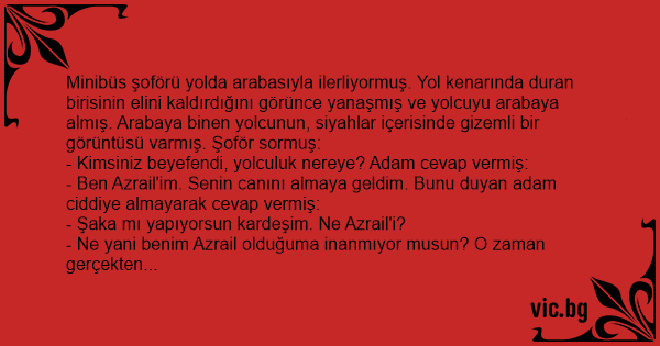 - Ne yani benim Azrail olduğuma inanmıyor musun? O zaman gerçekten Azrail olduğumu size ispatlayayım. 300 metre ileride elini kaldıran ve araba bekleyen bir kişi göreceğiz, onu da arabaya almalısın.