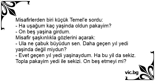 - Evet geçen yıl yedi yaşinaydum. Ha bu yil da sekiz. Topla pakayim yedi ile sekizi. On beş etmeyi mi?