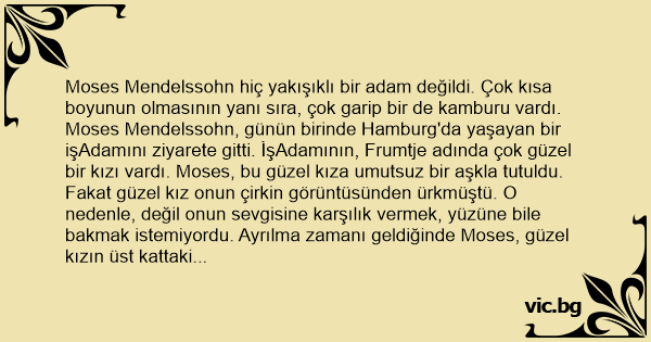 Моsеs Mendelssohn hiç yakışıklı bir adam değildi. Çok kısa boyunun olmasının yanı sıra, çok garip bir de kamburu vardı. Моsеs Mendelssohn, günün birinde Hamburg'da yaşayan bir işAdamını ziyarete gitti. İşAdamının, Frumtje adında çok güzel bir kızı vardı. Моsеs, bu güzel kıza umutsuz bir aşkla tutuldu.