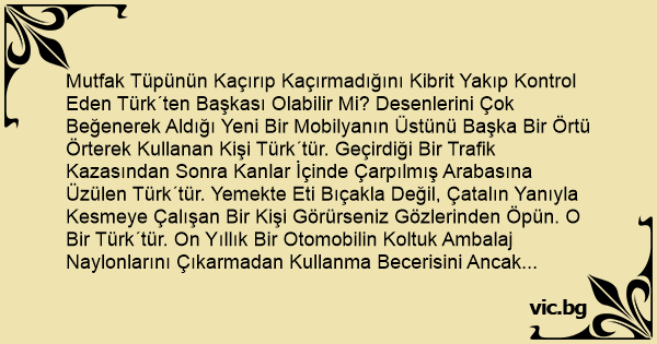 Mutfak Tüpünün Kaçırıp Kaçırmadığını Kibrit Yakıp Kontrol Eden Türk´ten Başkası Olabilir Mi? Desenlerini Çok Beğenerek Aldığı Yeni Bir Mobilyanın Üstünü Başka Bir Örtü Örterek Kullanan Kişi Türk´tür. Geçirdiği Bir Trafik Kazasından Sonra Kanlar İçinde Çarpılmış Arabasına Üzülen Türk´tür. Yemekte Eti Bıçakla Değil, Çatalın Yanıyla Kesmeye Çalışan Bir Kişi Görürseniz Gözlerinden Öpün. O Bir Türk´tür. On Yıllık Bir Otomobilin Koltuk Ambalaj Naylonlarını Çıkarmadan Kullanma Becerisini Ancak Türk´ler Gösterebilir. Çayı, Çay Tabağına Döküp İçen Bir Türk Değil Midir? Kırmızı Işıkta Durduğunuz İçin size Ancak Bir Türk bağırabilir. Ancak Bir Türk Kolayı Çalkalayıp Fışkırtarak Asitsiz İçmeyi Akıl Edebilir. Otoyolda Otomobilin Gaz Pedalına Tuğla Koyup, Yorulmadan Kullanma Fikri Bir Türk´ündür. Elektronik Hesap Makinesini Yada Uzaktan Kumandasını Naylona Sarıp Üzerinede Ambalaj Lastiği Geçiren Türk´tür.