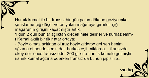 - Böyle olmaz aclıktan ölürüz böyle giderse gel sen benim ağzıma et bende senin der. herkes eşit miktarda… fransızda okey der. önce fransız eder 200 gr sıra namık kemale gelmiştir namık kemal ağzına ederken fransız da bunun pipisi ile oynar ve namık kemal 2kg sıçar.