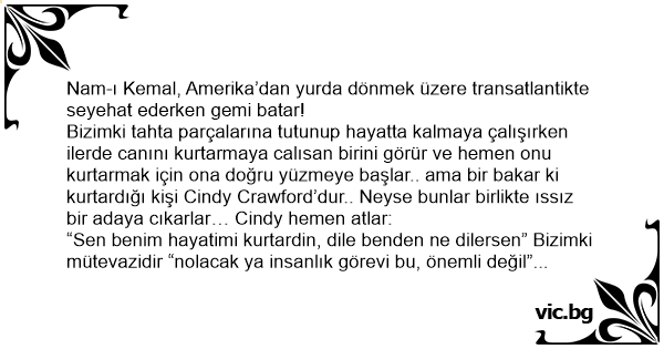 “Ya birader geçen gün gemi battı, birini kurtardım bir baktım ki Cindy Crawford’muş, inan ki her gün beş posta, her gün beş posta”