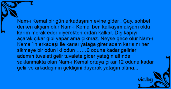 Nam-ı Kemal bir gün arkadaşının evine gider . Çay, sohbet derken akşam olur Nam-ı Kemal ben kalkayım akşam oldu karım merak eder diyerekten ordan kalkar. Dış kapıyı açarak çıkar gibi yapar ama çıkmaz. Neyse gece olur Nam-ı Kemal`in arkadaşı ile karısı yatağa girer adam karısını her sikmeye bir odun iki odun ……6 oduna kadar gelirler adamın tuvaleti gelir tuvalete gider yatağın altında saklanmakta olan Nam-ı Kemal ortaya çıkar 12 oduna kadar gelir ve arkadaşının geldiğini duyarak yatağın altına girer adam kadına kaç odun kaldıgını söyler kadın 12 der adam hayır 6 da kalmıştık der Nam-ı Kemal yatağın altından çıkar ve der ki: