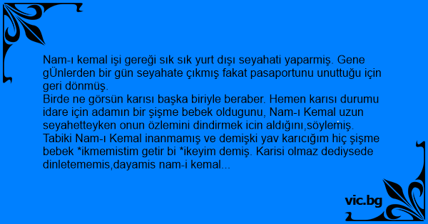 Tabiki Nam-ı Kemal inanmamış ve demişki yav karıcığım hiç şişme bebek *ikmemistim getir bi *ikeyim demiş. Karisi olmaz dediysede dinletememis,dayamis nam-i kemal aleti, adam fena halde *ikiyormus. Nam-ı Kemal bir türlü sokamamış ve demişki -Hanım şu Almanyadan aldığım Matkabi getir acamiyorum deligi. Bunu duyan adam baslamis robot sesiyle -”BIIIB BIIIB TEKRAR DENEYINIZ SISTEMDEKI ARIZA GIDERILDI….