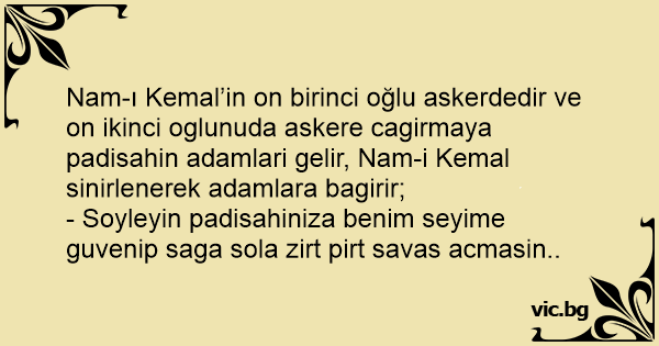 Nam-ı Kemal’in on birinci oğlu askerdedir ve on ikinci oglunuda askere cagirmaya padisahin adamlari gelir, Nam-i Kemal sinirlenerek adamlara bagirir;