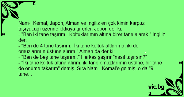 Nam-ı Kemal, Japon, Alman ve İngiliz en çok kimin karpuz taşıyacağı üzerine iddiaya girerler. Jopon der ki: