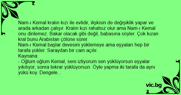 - Oğlum oğlum Kemal, seni izliyorum sen yüklüyorsun eşyalar yıkılıyor, sonra tekrar yüklüyorsun. Öyle yapma iki tarafa da aynı yükü koy. Dengele dengele… – Ahhh… Anacığım bi kere dengeledim Arabistan’a sürdüler bi daha dengeler miyim hiç…..