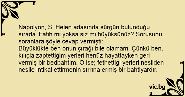 Napolyon, S. Helen adasında sürgün bulunduğu sırada ‘Fatih mi yoksa siz mi büyüksünüz? Sorusunu soranlara şöyle cevap vermişti: