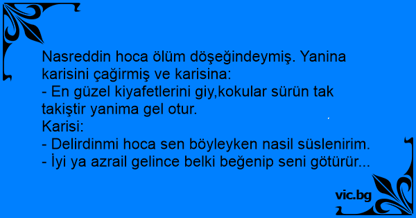 Nasreddin hoca ölüm döşeğindeymiş. Yanina karisini çağirmiş ve karisina:
