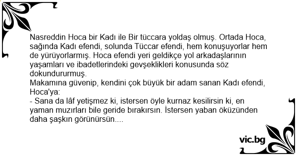Nasreddin Hoca bir Kadı ile Bir tüccara yoldaş olmuş. Ortada Hoca, sağında Kadı efendi, solunda Tüccar efendi, hem konuşuyorlar hem de yürüyorlarmış. Hoca efendi yeri geldikçe yol arkadaşlarının yaşamları ve ibadetlerindeki gevşeklikleri konusunda söz dokundururmuş.