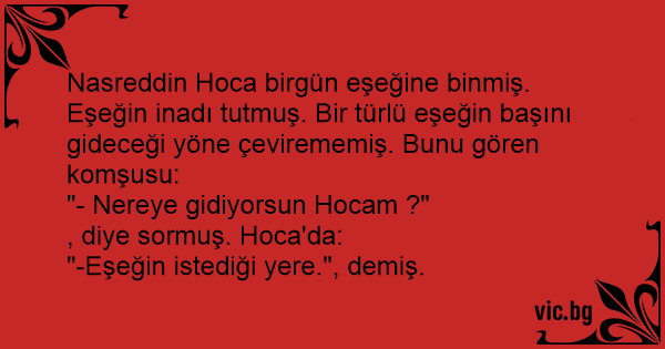 Nasreddin Hoca birgün eşeğine binmiş. Eşeğin inadı tutmuş. Bir türlü eşeğin başını gideceği yöne çevirememiş. Bunu gören komşusu: