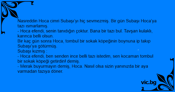 - Hoca efendi, ben senden ince belli tazı istedim, sen kocaman tombul bir sokak köpeği getirdin! demiş.