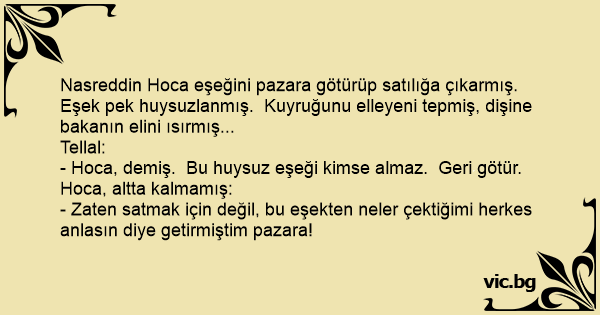 Nasreddin Hoca eşeğini pazara götürüp satılığa çıkarmış. Eşek pek huysuzlanmış. Kuyruğunu elleyeni tepmiş, dişine bakanın elini ısırmış...