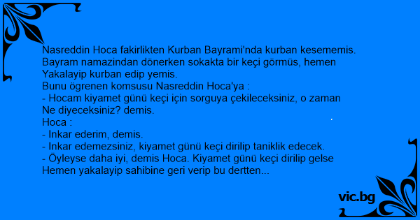 - Öyleyse daha iyi, demis Hoca. Kiyamet günü keçi dirilip gelse