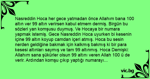 Nasreddin Hoca her gece yatmadan önce Allahım bana 100 altın ver 99 altın verirsen kabul etmem dermiş. Birgün bu sözleri yan komşusu duymuş. Ve Hocaya bir numara yapmak istemiş. Gece Nasreddin Hoca uyurken bi kesenin içine 99 altın koyup camdan içeri atmış. Hoca bu sesin nerden geldiğine bakmak için kalkmış bakmış ki bir para kesesi altınları saymış ve tam 99 altınmış. Hoca Demişki: Allahım sana şükürler olsun 99 altını veren Allah 100 ü de verir. Ardından komşu çıkıp yaptığı numarayı anlatmış ve parasını geri istemiş. Hoca ise bunu bana Allah gönderdi diyerek parayı vermemiş. Komşu İse Nasreddin Hocayı kadıya götürmek istemiş. Fakat Nasreddin Hoca: Oraya gidene kadar güzel bir at ve kürk getirirsen gelirim der. Komşu adam ise çaresizce bunları getirir ve kadıya giderler. Nasreddin Hoca: Bu adam neyi görse benimdir der. Hatta Üstümdekıne ve atıma bile benim diyor. Komşu İse: Üzgün bir biçimde benim tabi benim diyor. Kadıda onu huzurundan kovuyor. Eve geldiklerinde nasreddin hoca atı, kürkü ve paraları geri veriyor. Ve Şöyle diyor: Bir daha Allah ile Kulu Arasına Sakın Girme!