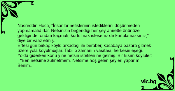 Nasreddin Hoca, "İnsanlar nefislerinin istediklerini düşünmeden yapmamalıdırlar. Nefsinizin beğendiği her şey ahirette önünüze geldiğinde, ondan kaçmak, kurtulmak isteseniz de kurtulamazsınız," diye bir vaaz etmiş.