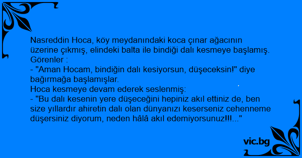 Nasreddin Hoca, köy meydanındaki koca çınar ağacının üzerine çıkmış, elindeki balta ile bindiği dalı kesmeye başlamış.