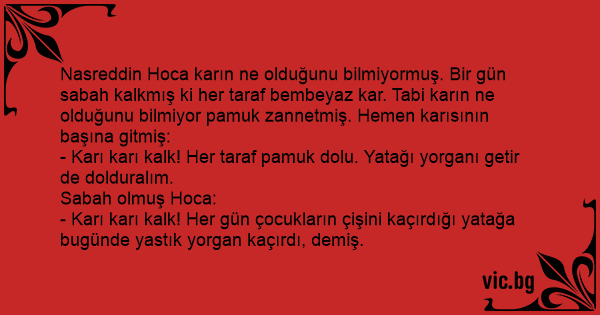 Nasreddin Hoca karın ne olduğunu bilmiyormuş. Bir gün sabah kalkmış ki her taraf bembeyaz kar. Tabi karın ne olduğunu bilmiyor pamuk zannetmiş. Hemen karısının başına gitmiş: