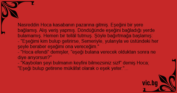 - "Hoca efendi" demişler, "eşeği bulana verecek olduktan sonra ne diye arıyorsun?"