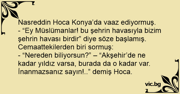 - “Nereden biliyorsun?” – “Akşehir’de ne kadar yıldız varsa, burada da o kadar var. İnanmazsanız sayın!..” demiş Hoca.