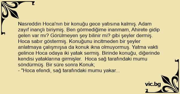 Nasreddin Hoca'nın bir konuğu gece yatısına kalmış. Adam zayıf inançlı biriymiş. Ben görmediğime inanmam, Ahirete gidip gelen var mı? Görülmeyen şey bilinir mi? gibi şeyler dermiş.