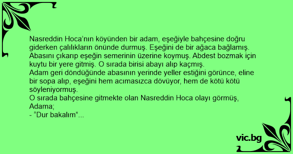 Nasreddin Hoca’nın köyünden bir adam, eşeğiyle bahçesine doğru giderken çalılıkların önünde durmuş. Eşeğini de bir ağaca bağlamış. Abasını çıkarıp eşeğin semerinin üzerine koymuş. Abdest bozmak için kuytu bir yere gitmiş. O sırada birisi abayı alıp kaçmış.