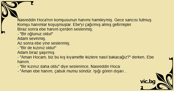 Nasreddin Hoca'nın komşusunun hanımı hamileymiş. Gece sancısı tutmuş. Komşu hanımlar koşuşmuşlar. Ebe'yi çağırmış almış getirmişler.