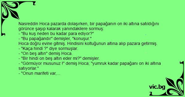 - "Görmüyor musunuz !" demiş Hoca; "yumruk kadar papağanı on iki altına satıyorlar."