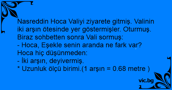 Nasreddin Hoca Valiyi ziyarete gitmiş. Valinin iki arşın ötesinde yer göstermişler. Oturmuş. Biraz sohbetten sonra Vali sormuş: