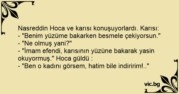 - "İmam efendi, karısının yüzüne bakarak yasin okuyormuş." Hoca güldü :
