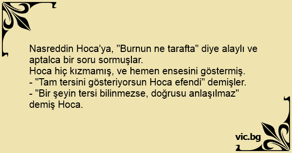 Nasreddin Hoca'ya, "Burnun ne tarafta" diye alaylı ve aptalca bir soru sormuşlar.
