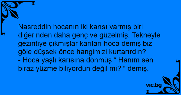 Nasreddin hocanın iki karısı varmış biri diğerinden daha genç ve güzelmiş. Tekneyle gezintiye çıkmışlar karıları hoca demiş biz göle düşsek önce hangimizi kurtarırdın?