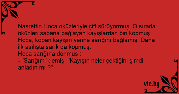 Nasrettin Hoca öküzleriyle çift sürüyormuş. O sırada öküzleri sabana bağlayan kayışlardan biri kopmuş.