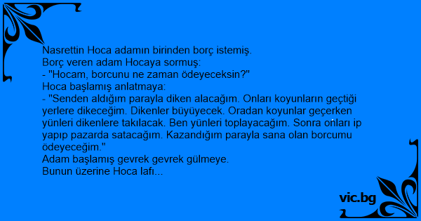 - "Senden aldığım parayla diken alacağım. Onları koyunların geçtiği yerlere dikeceğim. Dikenler büyüyecek. Oradan koyunlar geçerken yünleri dikenlere takılacak. Ben yünleri toplayacağım. Sonra onları ip yapıp pazarda satacağım. Kazandığım parayla sana olan borcumu ödeyeceğim."